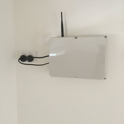 The POE injector for the radio, WiFi Gateway, and Power Supply for the Communications Panel were installed inside an equipment box modified to allow the WiFi antenna to be unobstructed. The equipment box was then installed inside a utility cupboard in the laundry. The utility box provides protection to the components allowing the home owner to use the storage space while also presenting a tidy installation.