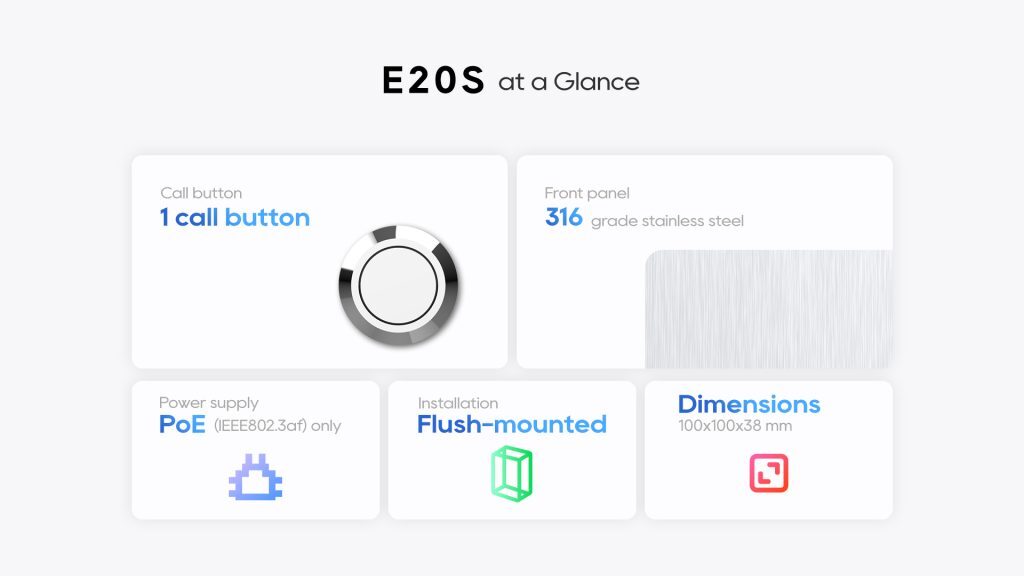E20S is a compact SIP emergency intercom that is ruggedized with 316-grade stainless steel. It is designed for indoor use and is compatible with 1299 and 86 type single in-wall boxes.