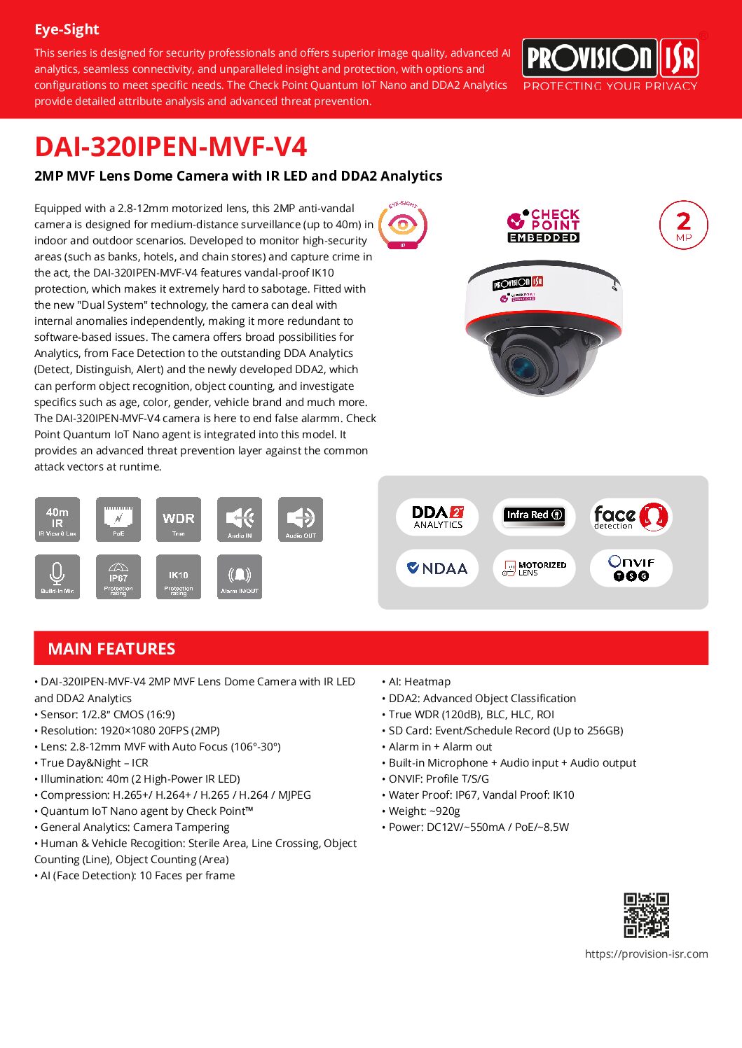 This model supports advanced analytics, including Face Detection, DDA Analytics (Detect, Distinguish, Alert), and DDA2, enabling object recognition, counting, and detailed classification based on age, color, gender, and vehicle brand. Fully NDAA-compliant, it integrates Check Point Quantum IoT Nano security, providing real-time threat prevention against cyber risks. The DAI-320IPEN-MVF-V4 is designed to eliminate false alarms, delivering exceptional security, reliability, and performance for high-security installations