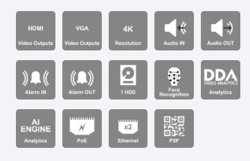 Input: 32 Channel (Via Network, 16 Port PoE) • Output: HDMI (4K), VGA • 2U Case • 8 x HDD with RAID • Audio In/Out • Alarm In/Out • 1000Mbps Network