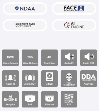 Input: 8 Channel (Via PoE/Network) • NDAA • Output: HDMI(4K)/VGA • Recording resolution – up to 12 Megapixels • Small 1U Case, 1 HDD • Audio In/Out • Alarm In/Out