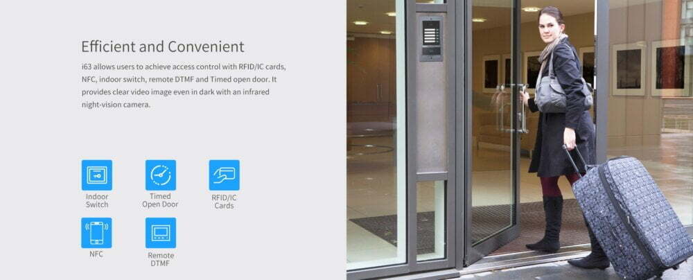 Based on SIP and ONVIF protocols, i63 is a video door phone that integrates powerful functionalities of access control, intercom, and security protection.