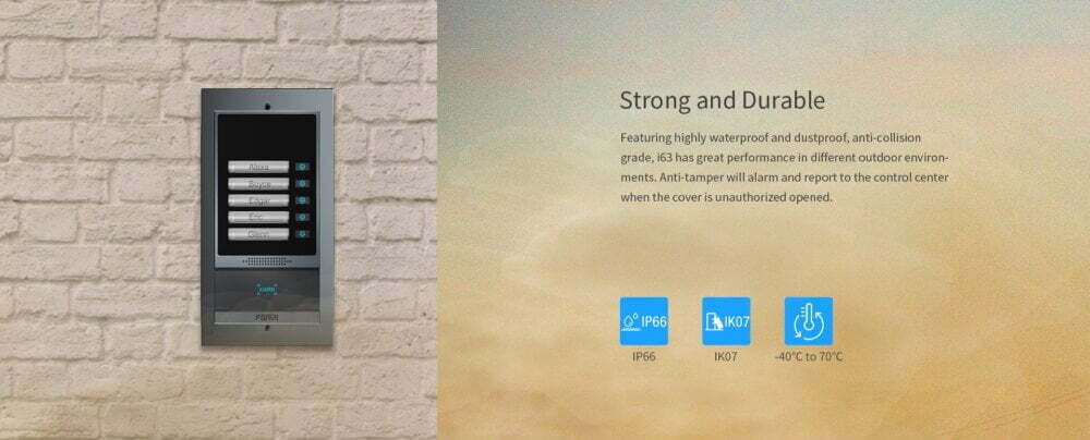 With high protection level IP66 and IK07, it is waterproof, dustproof and anti-collision in most outdoor environments. i63 allows users to make audio/video calls via 5 speed-dial buttons and a 2 Mega-pixel camera and achieve access control by different modes.